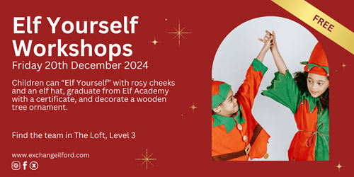 Children can โElf Yourselfโ with rosy cheeks and an elf hat, graduate from Elf Academy with a certificate, and decorate a wooden tree ornament.